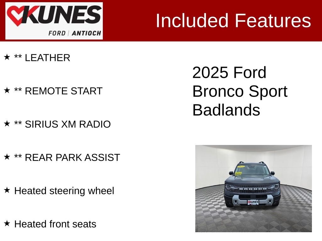 2025 Ford Bronco Sport Badlands EcoBoost 2.0L I4 GTDi DOHC Turbocharged VCT 8-Speed Automatic 4WD Clean CARFAX. CARFAX One-Owner. Odometer is 956 miles below market average! 21/27 City/Highway MPG