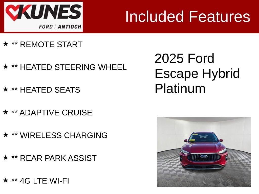 2025 Ford Escape Hybrid Platinum 2.5L iVCT eCVT AWD Clean CARFAX. CARFAX One-Owner. Odometer is 2220 miles below market average! 42/36 City/Highway MPG