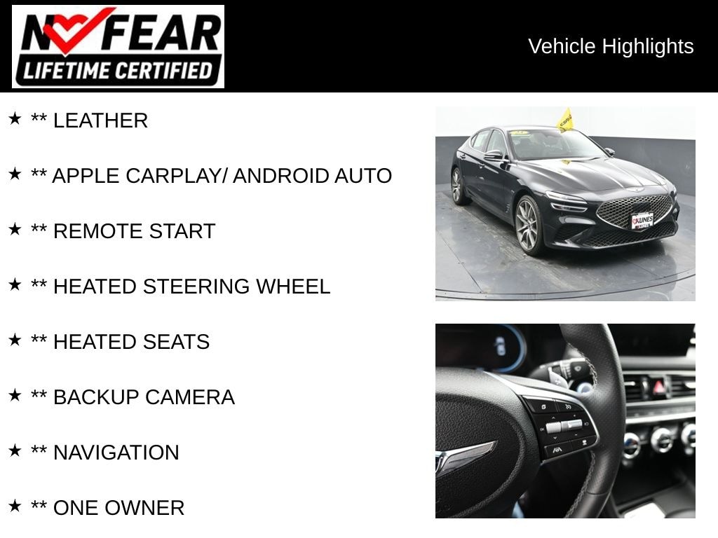 2023 Genesis G70 2.0T I4 8-Speed Automatic with SHIFTRONIC AWD Clean CARFAX. CARFAX One-Owner. Odometer is 27603 miles below market average! 20/28 City/Highway MPG