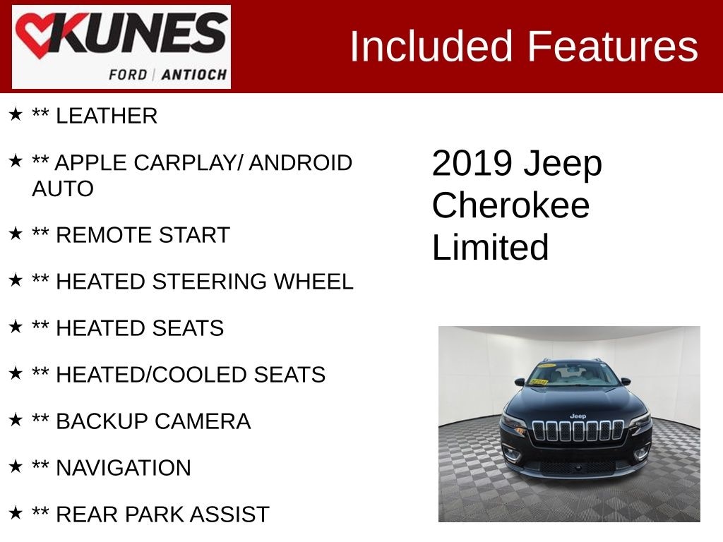 2019 Jeep Cherokee Limited 3.2L V6 9-Speed 948TE Automatic FWD Clean CARFAX. Odometer is 61131 miles below market average! 20/29 City/Highway MPG