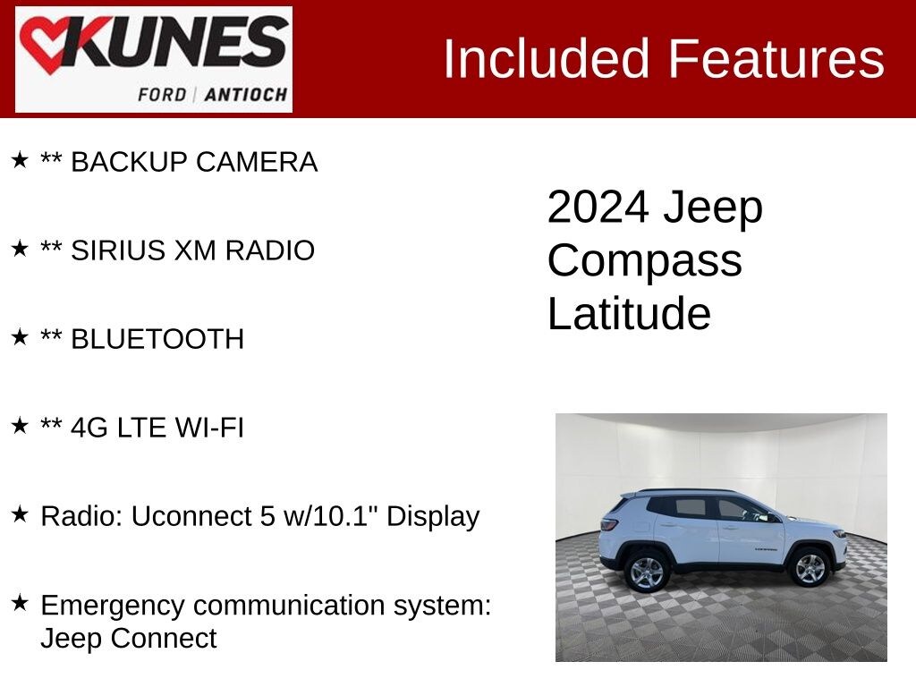 2024 Jeep Compass Latitude 2.0L I4 DOHC 8-Speed Automatic 4WD Clean CARFAX. CARFAX One-Owner. 24/32 City/Highway MPG