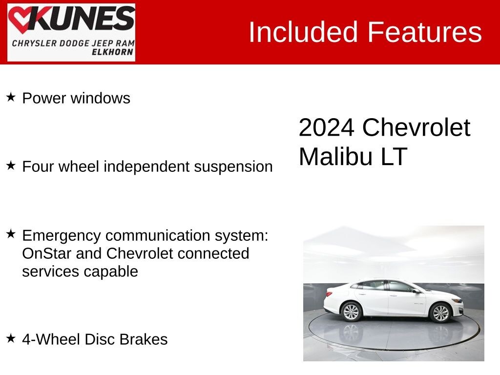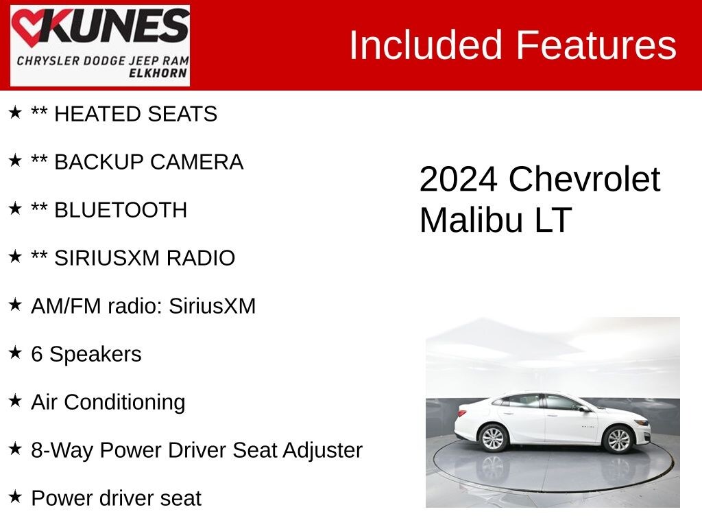 2024 Chevrolet Malibu LT 1LT 1.5L DOHC CVT FWD CARFAX One-Owner. Clean CARFAX. Odometer is 5136 miles below market average! 28/36 City/Highway MPG