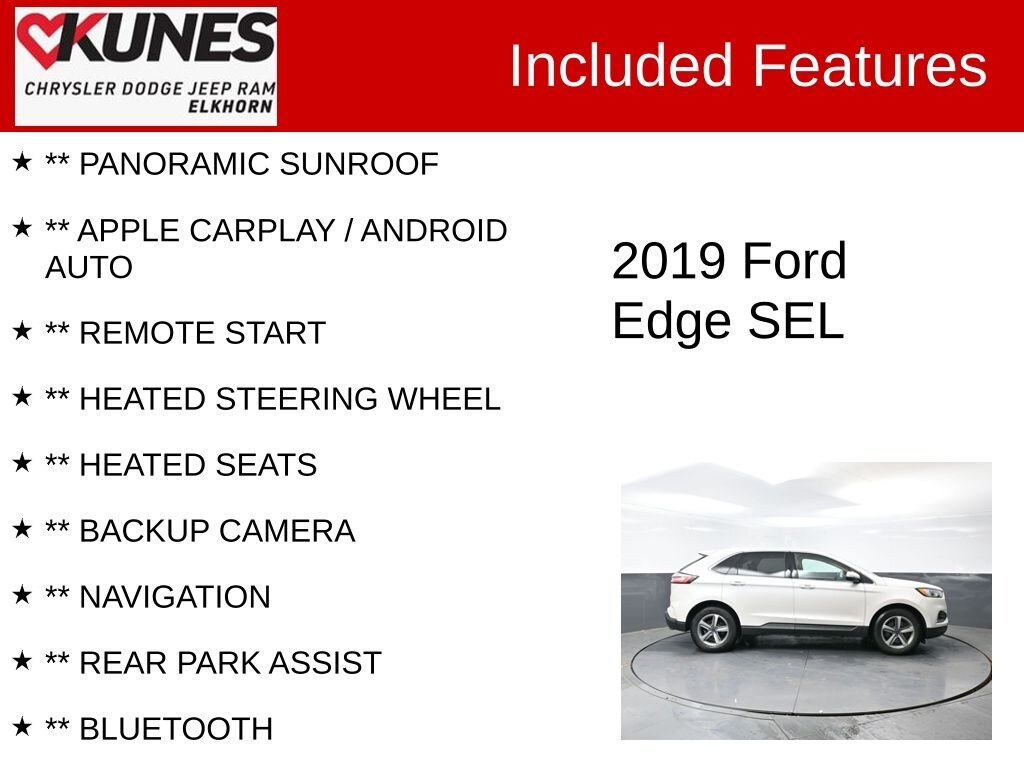 2019 Ford Edge SEL EcoBoost 2.0L I4 GTDi DOHC Turbocharged VCT 8-Speed Automatic AWD Clean CARFAX. Odometer is 21998 miles below market average! 21/28 City/Highway MPG