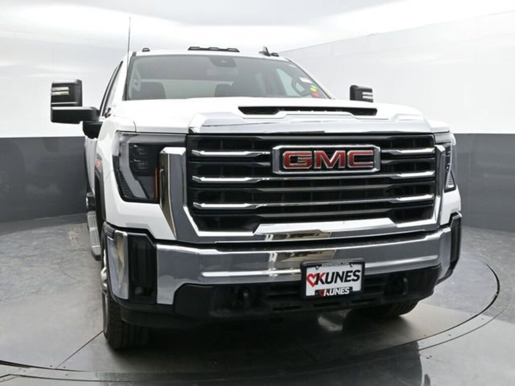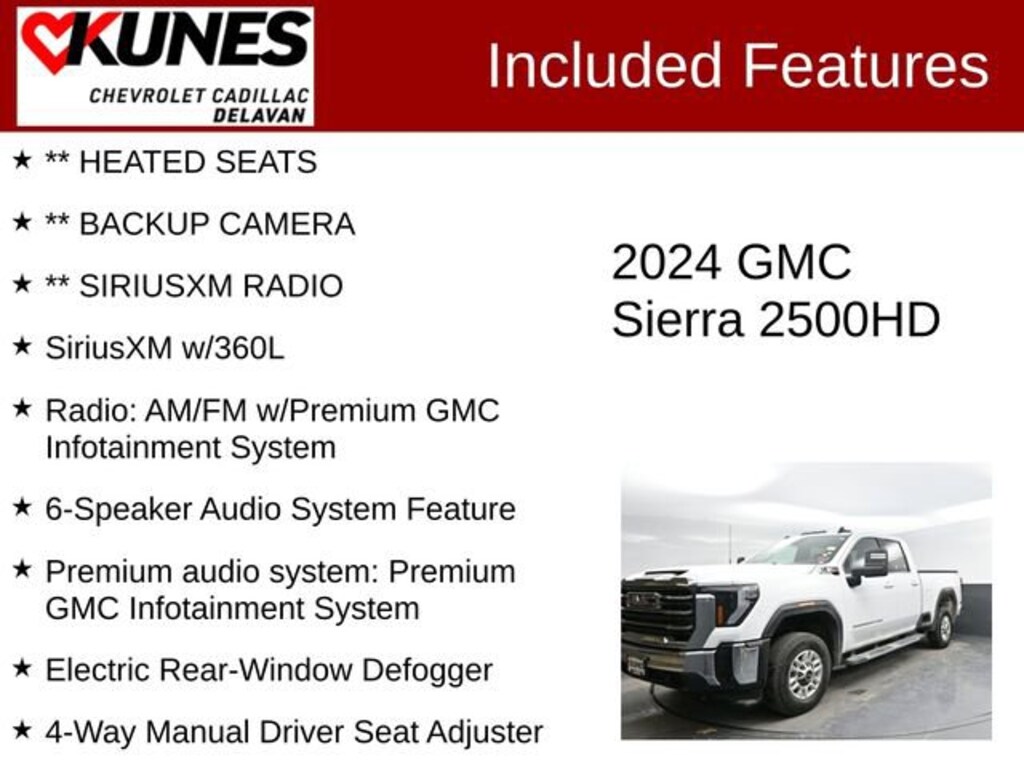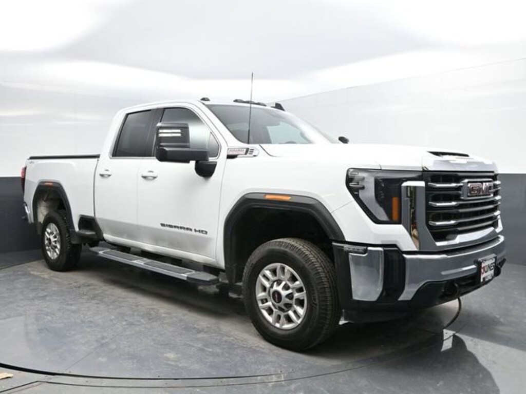 2024 GMC Sierra 2500HD SLE Summit White 4WD Duramax 6.6L V8 TurbodieselRecent Arrival! CARFAX One Owner. 6.6L V8 Diesel Turbocharged engine SLE Convenience Package: power driver seat, climate control, fog lamps, adjustable steering wheel Remote start, rear defrost, and security system Heated front seats and heated steering wheel Snow plow prep/camper package Tow package with hitch Running boards Rear parking sensors and backup camera Front collision mitigation and warning Lane departure warning, automatic highbeams Blind spot monitoring not listed Privacy glass and integrated signal mirrors Power windows, power door locks, keyless entry, and keyless start Aluminum wheels with all-season tires Cruise control Rear bench seat and split front bench seat Satellite radio and WiFi hotspot capability 10-speed automatic, four-wheel drive, locking/limited slip differential 220-amp alternator, skid plates, exhaust brake 120-volt bed-mounted and instrument panel power outlets Auxiliary audio input, MP3 capability, telematics system