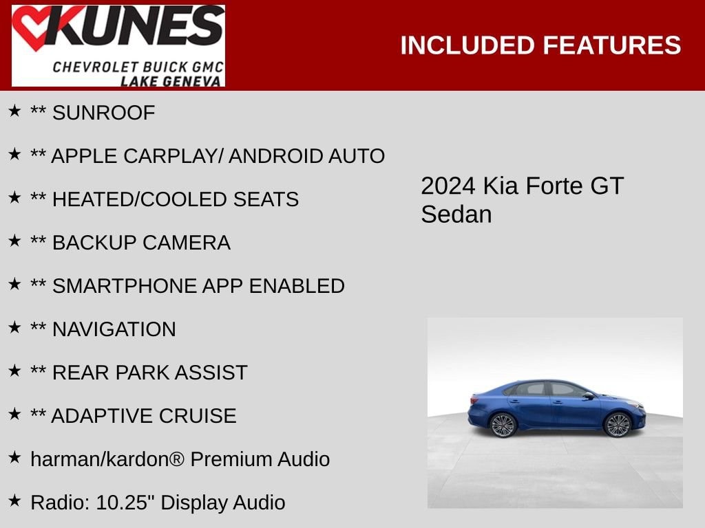 2024 Kia Forte GT Deep Sea Blue FWD 1.6L I4 TurboRecent Arrival! Clean CARFAX. CARFAX One Owner. GT2 Package with premium sound, cooled front seat, heated front seat, navigation, satellite radio, and sunroof Floor mats Adaptive cruise control for relaxed long drives Blind spot monitoring for added safety Heated front seats and cooled front seats Power sunroof/moonroof Premium audio system Rear parking sensors and backup camera Navigation system with smart device integration Auxiliary and HD radio Apple CarPlay and Android Auto compatibility Automatic headlights with LED lighting Fog lamps and rear spoiler Lane departure warning and lane keeping assist Forward collision mitigation and driver attention warning Multi-zone climate control with air conditioning Leather steering wheel and premium synthetic seats Aluminum wheels with sport-tuned suspension Keyless entry and push-button start Power windows, power locks, and remote trunk release Stability control, traction control, and multiple airbags
