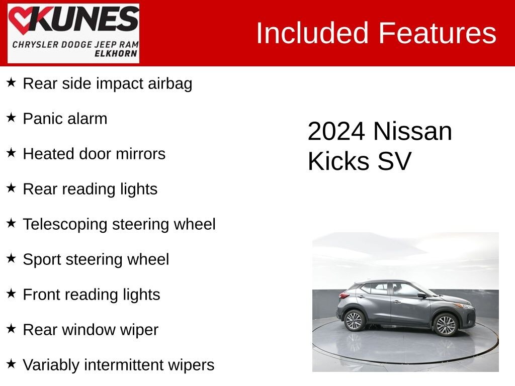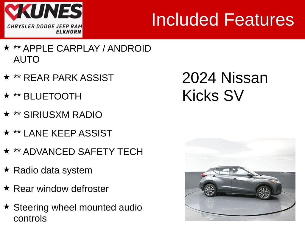 2024 Nissan Kicks SV 1.6L 4-Cylinder DOHC 16V CVT with Xtronic FWD CARFAX One-Owner. Odometer is 1090 miles below market average! 31/36 City/Highway MPG