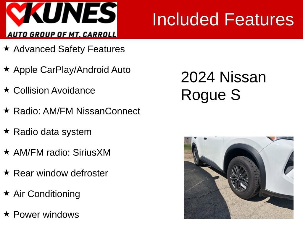 2024 Nissan Rogue S Glacier White AWD 1.5L DOHCRecent Arrival! Clean CARFAX. CARFAX One Owner. Includes factory-installed floor mats, cargo area protector, and seatback protector Intelligent all-wheel drive with terrain modes Automatic emergency braking with pedestrian detection Rear automatic braking and forward collision warning Intelligent lane intervention and lane departure warning Blind spot warning and rear cross traffic alert High beam assist for improved nighttime visibility LED headlights, LED tail lamps, and LED daytime running lights Cruise control for relaxed highway driving Apple CarPlay® and Android Auto smartphone integration SiriusXM® radio capability with 8-inch touchscreen display Dual power outside mirrors Advanced airbag system with LATCH child safety Push button start for convenience Voice recognition for hands-free operation Xtronic CVT® automatic transmission Tire pressure monitoring system 17-inch alloy wheels 60/40 split fold-down rear seat Rear privacy glass