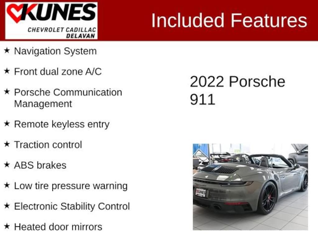 ABS brakes, Alloy wheels, Electronic Stability Control, Front dual zone A/C, Heated door mirrors, Heated front seats, Illuminated entry, Low tire pressure warning, Navigation System, Porsche Communication Management, Remote keyless entry, Traction control.